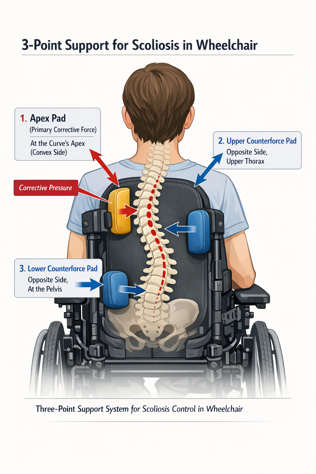 Som udgangspunkt for 3-punkts korrektion af skoliose i kørestol er det vigtigste ikke selve ryggen, men bækkenet og siddestillingen.