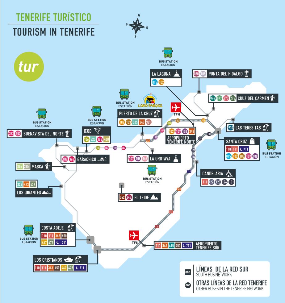 Titsa har forskellige muligheder for rabat kort – fx kan du køre med bus, sporvogn og tog over alt på Tenerfe for € 10 for 24 timer eller € 50 for 7 dage.